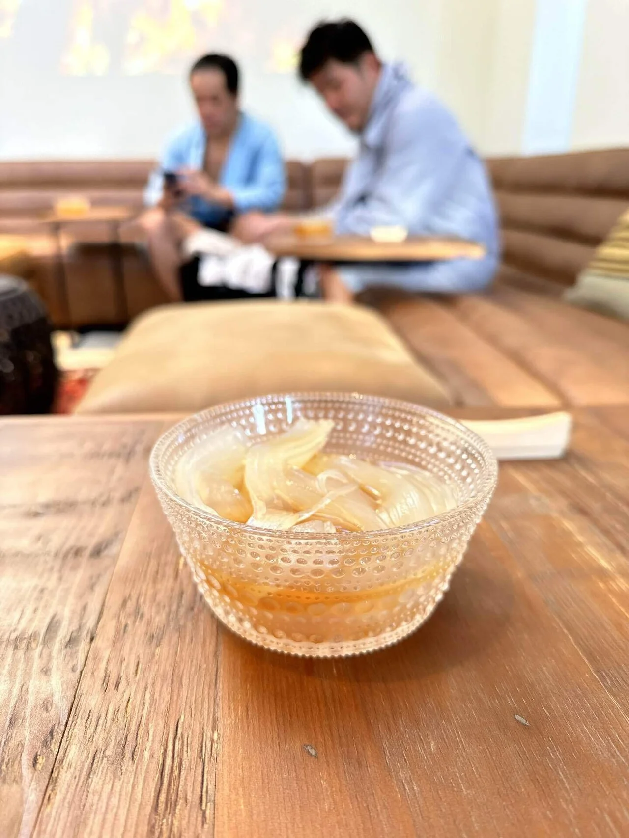 三たび、ラウンジに戻る。ここで、朝からこの日一食目の飯。“ところてん”をすする。食べるというよりはすする。絹みたいに滑らかなところてんにサッパりと甘くないポン酢、青みかんの皮が素晴らしいアクセントになる。静岡市内で50年続く用宗さんのところてん、サーマルクライムスタジオ富士のオリジナルアレンジ。朝昼抜いた“オートファジー”דサウナによる空腹”、さらに一分の隙もなく温められた内臓は、冷たく冷えたところてんが喉の奥からゆっくりと大胸筋の間をすべり落ちて行くのを感じる事ができる。