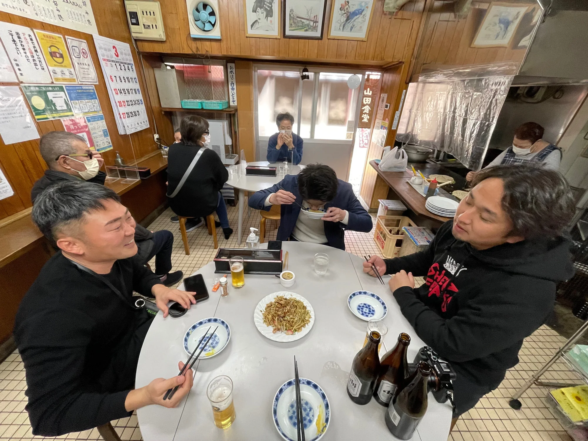 付近を散歩したら目的地の山田食堂へ入る。お店に入っても「注文いいですか?」とか「すみません」とか言っちゃダメだ。席に座ったらただおばちゃんとの間をとる。開店前から入っている持ち帰りを作り終えたら、おばちゃんがこっちにくる。頼むべきはネギ焼きと焼きうどん、焼き飯。だいたい4人くらいで行くので、ネギ焼き3枚、焼きうどん2つ、焼き飯1つくらいがちょうどいい。注文終わると「ビール飲んで待ってます!おでん適当にください。」って感じで頼めるとカッコいい。