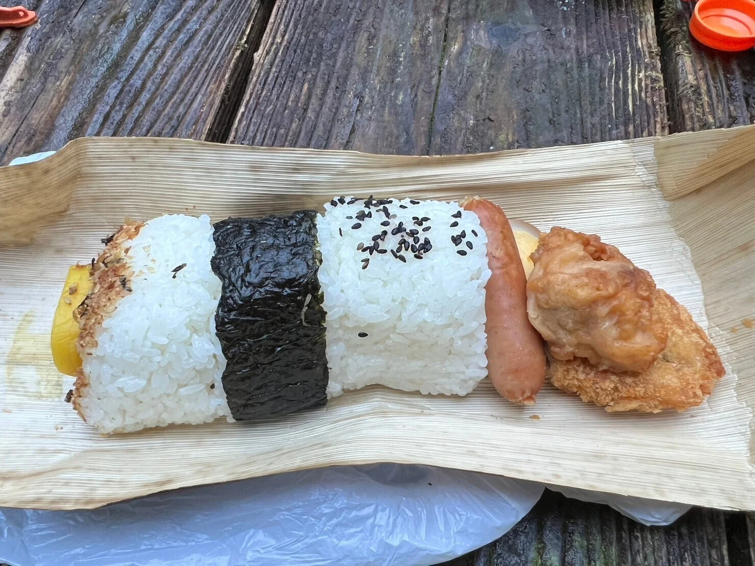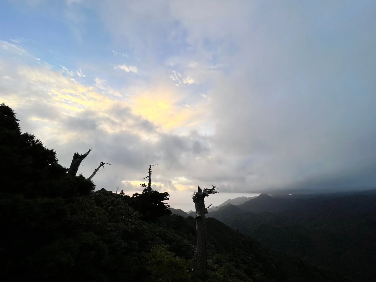 3時にホテルを出て白谷雲水峡へと向かう途中、朝日屋弁当店で竹の葉弁当を受け取る。おにぎり三つに唐揚げとソーセージ、アジフライと沢庵のシンプルなお弁当。これがまたいい。四時ごろ白谷雲水峡の駐車場に着いた。駐車場には僕たち一台だけ!エンジンを切ると見た事無いくらいに綺麗な星空。なんだけど2人はめちゃくちゃ不安そう。そりゃそうだ、真っ暗闇の山の中そりゃ怖かっただろうけど、幸大ちゃんに「それヤバいね、黒のウェア。蜂の気がたってる時期だからスズメバチ気をつけて。」幸大ちゃんは黙ってしまった。